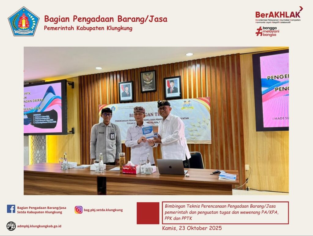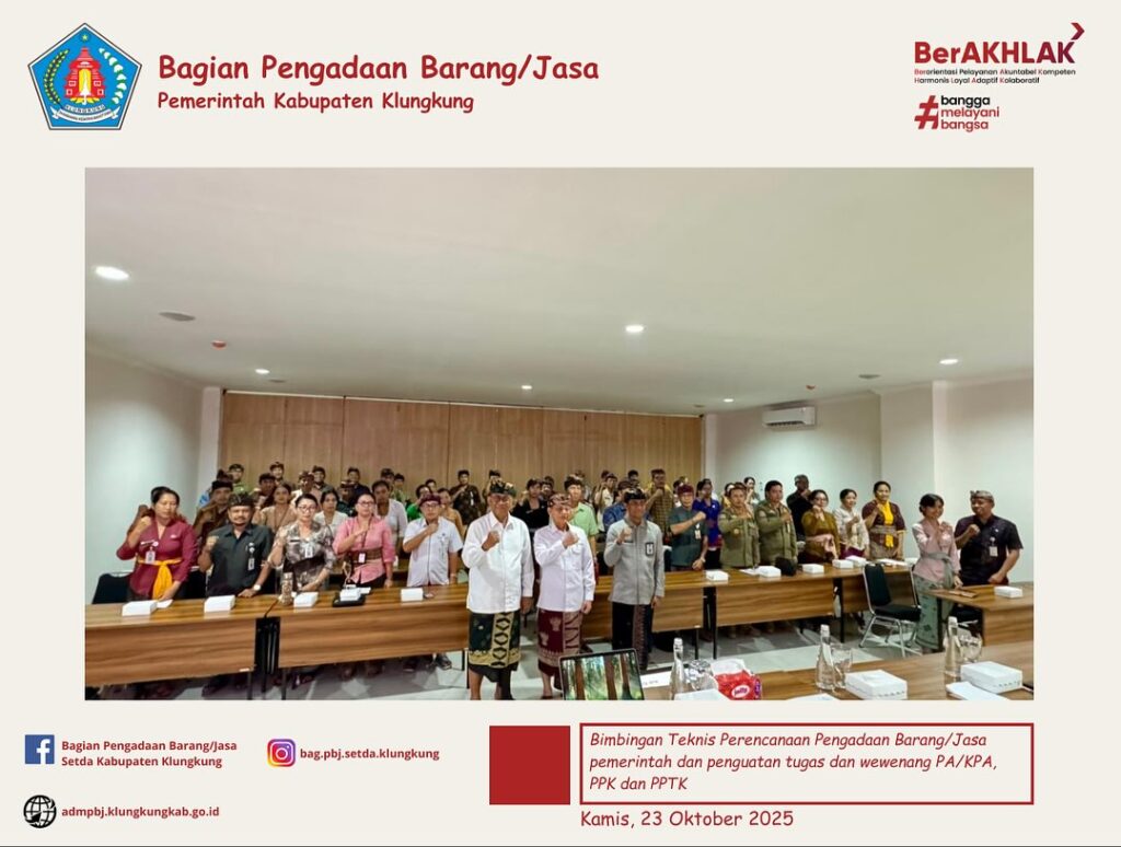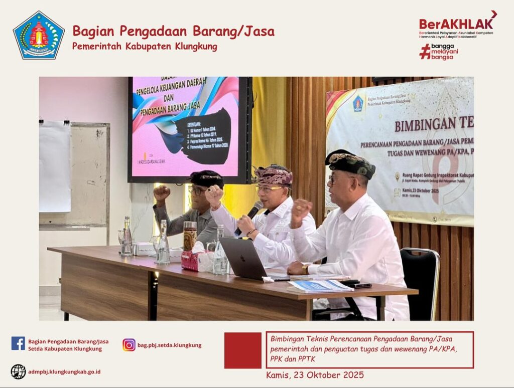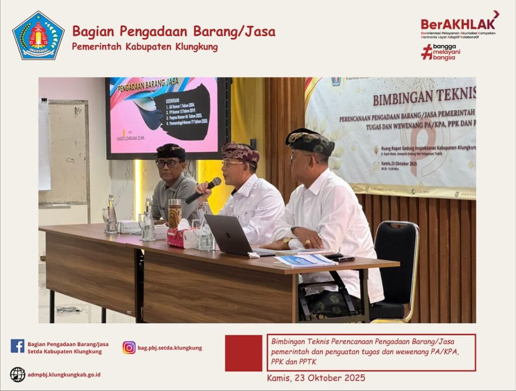 Dalam rangka meningkatkan pengetahuan dan kemampuan para Pelaku Pengadaan Barang/Jasa di lingkungan Pemerintah Kabupaten Klungkung, Bagian Pengadaan Barang/Jasa Sekretariat Daerah Kabupaten Klungkung mengadakan Bimbingan Teknis Perencanaan Pengadaan Barang/Jasa pemerintah dan penguatan tugas dan wewenang PA/KPA, PPK dan PPTK di lingkungan Pemerintah Kabupaten Klungkung. Bimtek dilaksanakan pada hari Kamis, 23 Oktober 2025 pukul 09.00 Wita bertempat di Ruang Rapat Gedung Inspektorat Kabupaten Klungkung.