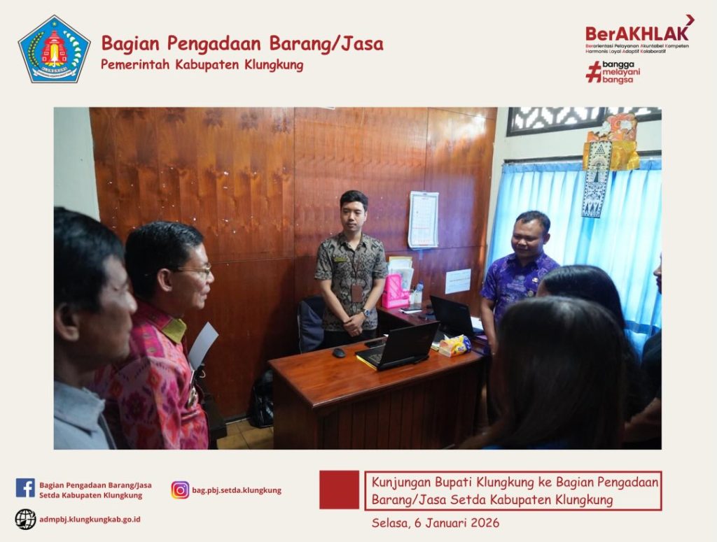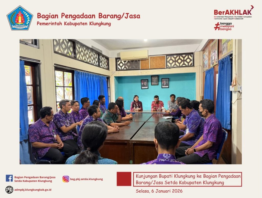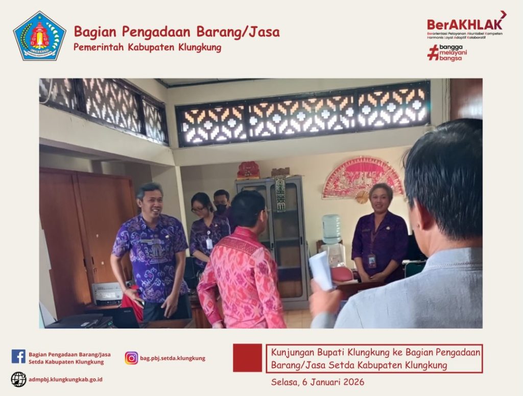 Bagian Pengadaan Barang/Jasa Sekretariat Daerah Kabupaten Klungkung menerima kunjungan Bupati Klungkung, I Made Satria, yang didampingi oleh Asisten Perekonomian dan Pembangunan, Luh Ketut Ari Citrawati, S.Sos., M.M. dan diterima oleh Kepala Bagian Pengadaan Barang/Jasa Setda Kabupaten Klungkung, Anak Agung Gede Anom Duarasoma, S.T beserta JF Pengelola Pengadaan Barang/Jasa serta staf.