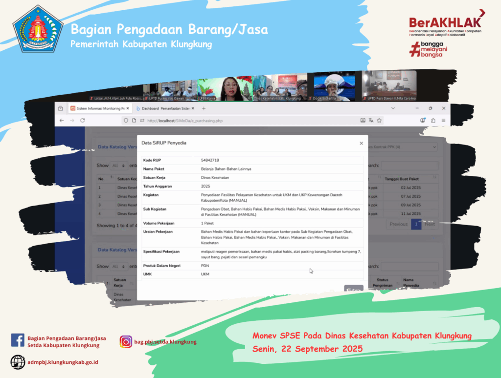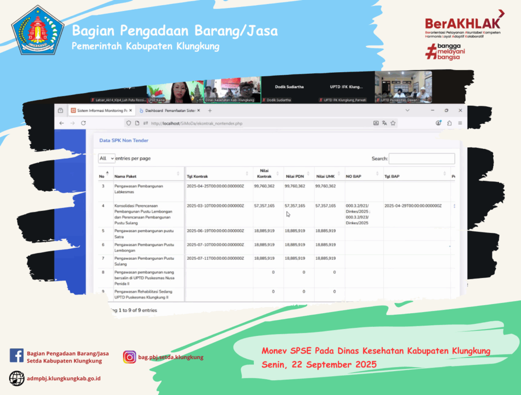 Diharapkan dengan adanya monev ini, Dinas Kesehatan Kabupaten Klungkung segera melanjutkan pencatatan non tender, pencatatan swakelola, dan paket lain yang belum tercatatkan realisasinya agar dapat dicatatkan. Paket yang belum melakukan pengisian e-Kontrak agar segera upload BAP, BAST, progress pekerjaan dan mengisi penilaian kinerja penyedia.