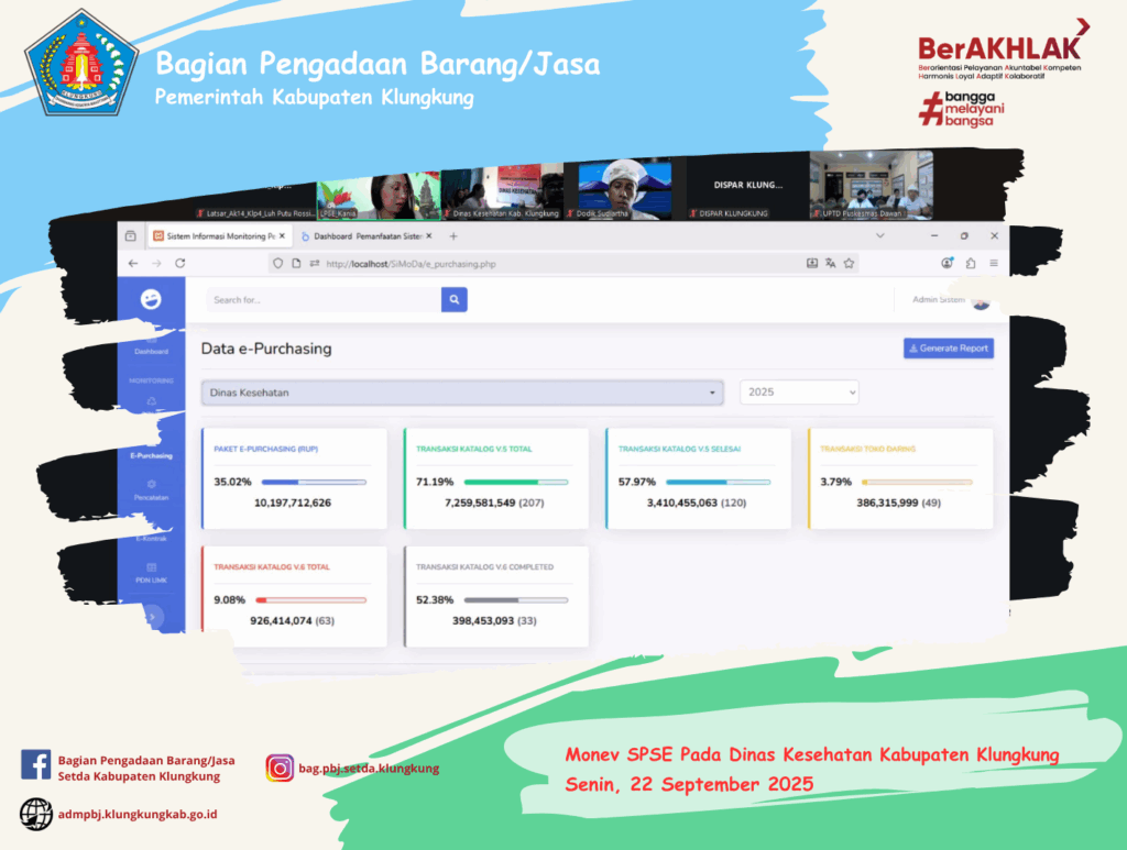 Monitoring dan Evaluasi Pelaksanaan SPSE dan E-Katalog Triwulan III dilaksanakan secara daring dengan tujuan untuk mengetahui pelaksanaan proses Pengadaan Barang/Jasa, baik yang melalui SPSE maupun e-Katalog. Data SPSE yang dimonitoring adalah data Tender, Non Tender, E-Katalog V5 dan V6, serta sejauh mana kemajuan Pencatatan Non Tender dan Swakelola yang dilakukan oleh Perangkat Daerah setelah dilakukan Monev pada Semester II sebelumnya. Evaluasi yang dilakukan adalah inputan data di e-kontrak, Pencatatan Non Tender dan Swakelola baik itu nilai PDN, UMK, Progress pekerjaan dan penilaian kinerja penyedia. Serta menginformasikan kepada Perangkat Daerah, paket yang belum dilakukan penyelesaian di E-Katalog V5, yang belum dilakukan pembayaran di E-Katalog V6 dan paket yang belum dicatatkan ataupun di proses.