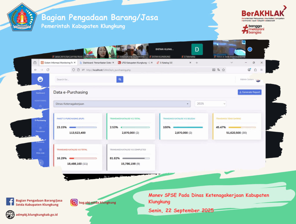 Monitoring dan Evaluasi Pelaksanaan SPSE dan E-Katalog Triwulan III dilaksanakan secara daring dengan tujuan untuk mengetahui pelaksanaan proses Pengadaan Barang/Jasa, baik yang melalui SPSE maupun e-Katalog. Data SPSE yang dimonitoring adalah data Tender, Non Tender, E-Katalog V5 dan V6, serta sejauh mana kemajuan Pencatatan Non Tender dan Swakelola yang dilakukan oleh Perangkat Daerah setelah dilakukan Monev pada Semester II sebelumnya. Evaluasi yang dilakukan adalah inputan data di e-kontrak, Pencatatan Non Tender dan Swakelola baik itu nilai PDN, UMK, Progress pekerjaan dan penilaian kinerja penyedia. Serta menginformasikan kepada Perangkat Daerah, paket yang belum dilakukan penyelesaian di E-Katalog V5, yang belum dilakukan pembayaran di E-Katalog V6 dan paket yang belum dicatatkan ataupun di proses.