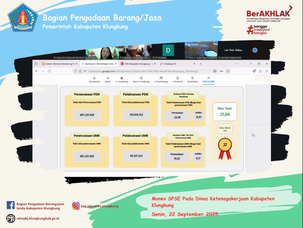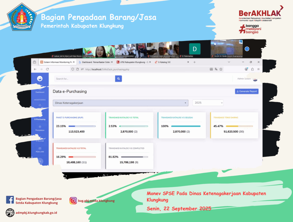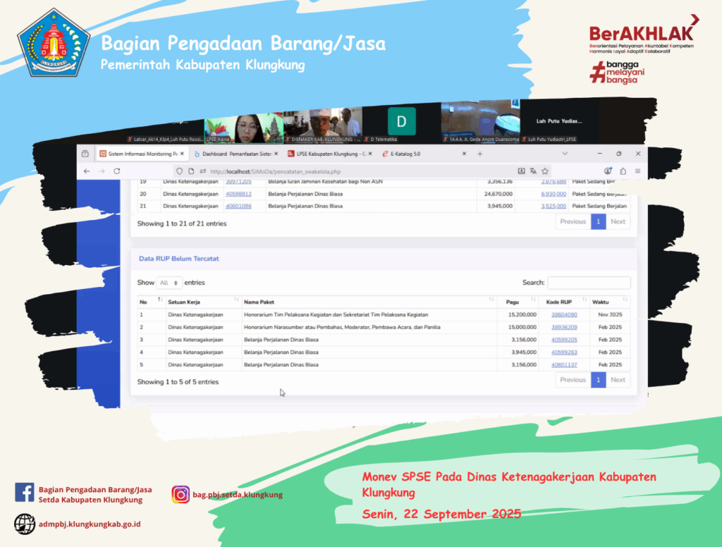 Diharapkan dengan adanya monev ini, Dinas Ketenagakerjaan Kabupaten Klungkung segera melanjutkan pencatatan non tender, pencatatan swakelola, dan paket lain yang belum tercatatkan realisasinya.