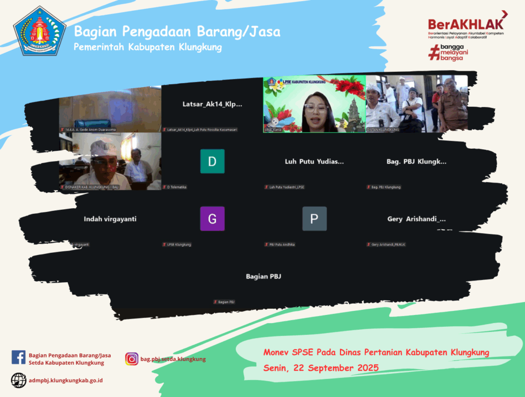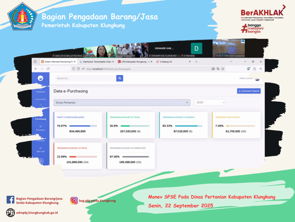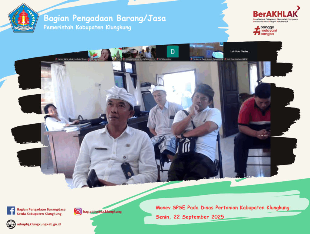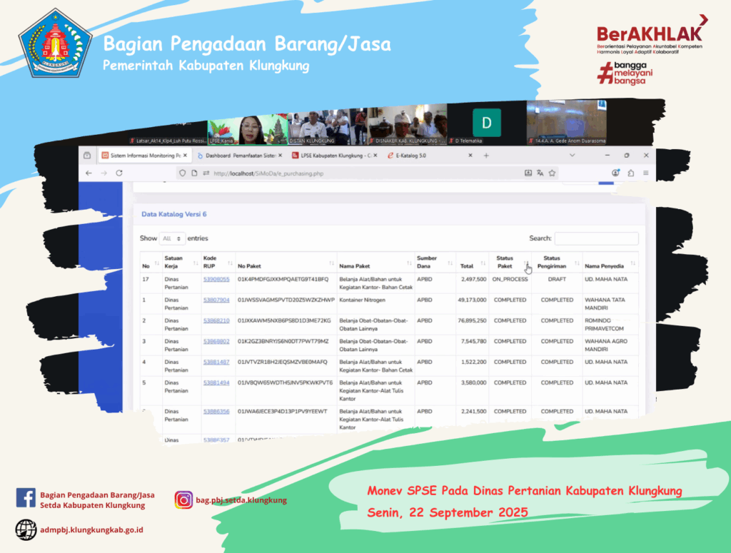 Diharapkan dengan adanya monev ini, Dinas Pertanian Kabupaten Klungkung segera melanjutkan pencatatan non tender, pencatatan swakelola, dan paket lain yang belum tercatatkan realisasinya.