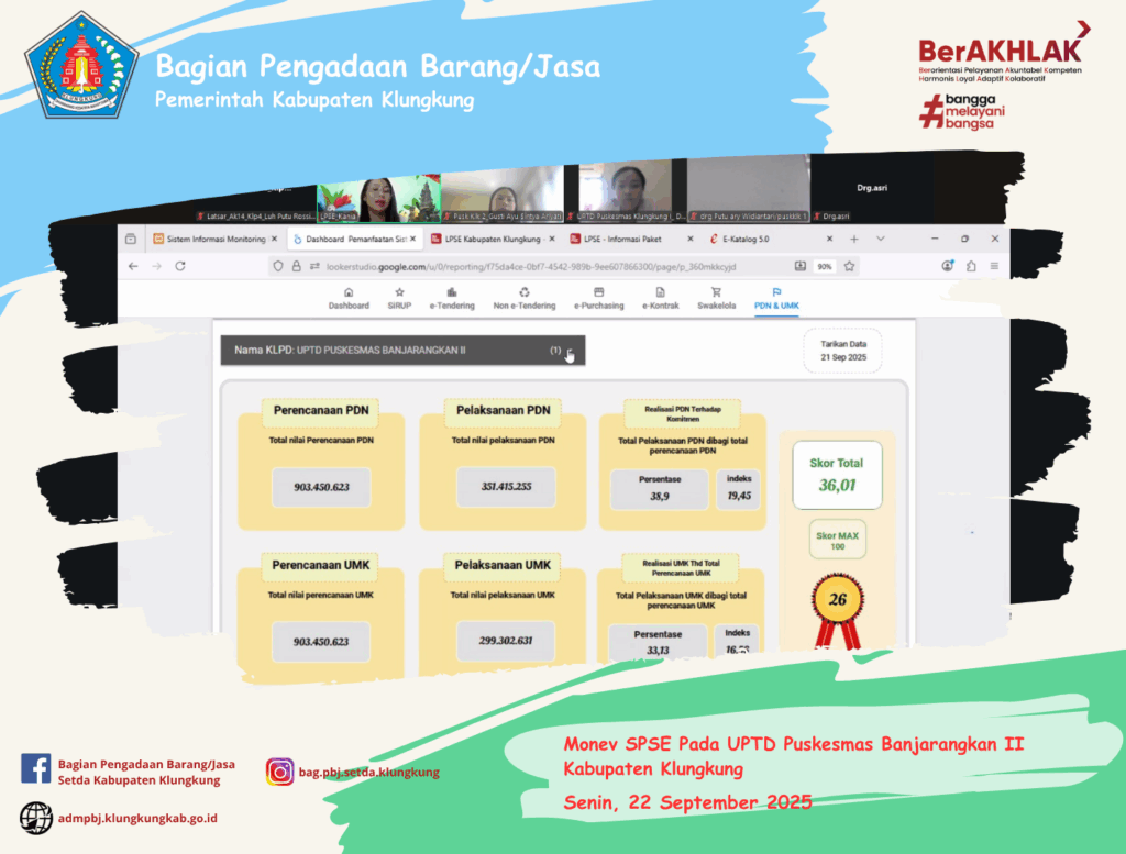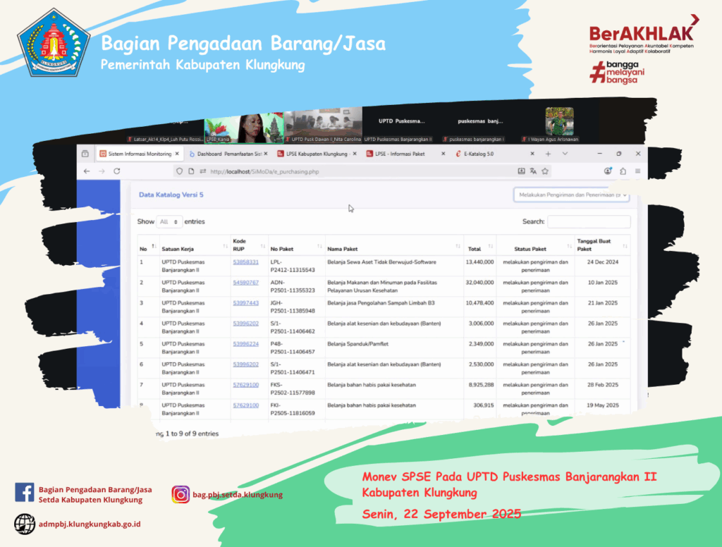 Diharapkan dengan adanya monev ini, UPTD Puskesmas Banjarangkan II Kabupaten Klungkung segera melanjutkan pencatatan non tender, pencatatan swakelola, dan paket lain yang belum tercatatkan realisasinya.