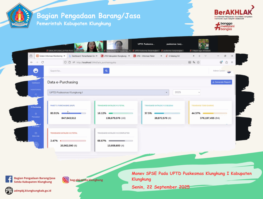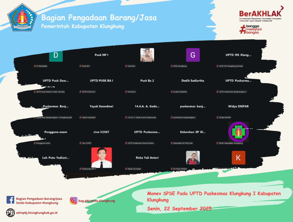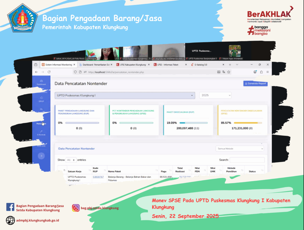 Diharapkan dengan adanya monev ini, UPTD Puskesmas Klungkung I Kabupaten Klungkung segera melanjutkan pencatatan non tender, pencatatan swakelola, dan paket lain yang belum tercatatkan realisasinya.