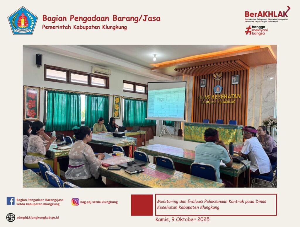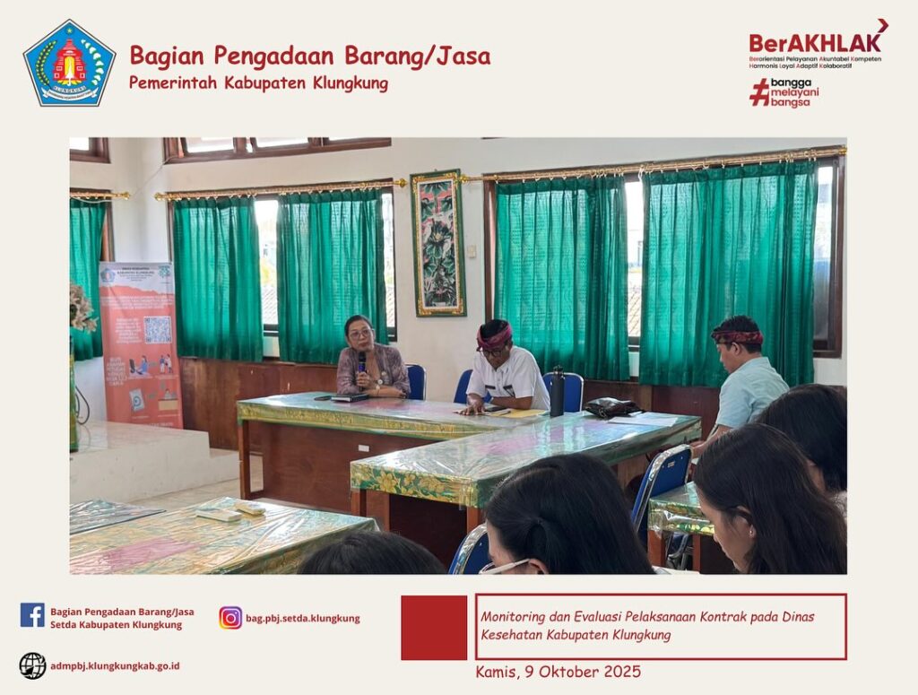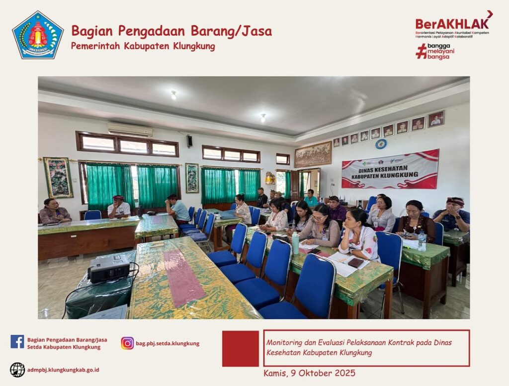 Monitoring dan Evaluasi Pelaksanaan Kontrak Tahun Anggaran 2025 pada hari ini dipimpin oleh Kepala Bagian Pengadaan Barang/Jasa, Bapak Ir. Anak Agung Gede Anom Duarasoma, ST dengan didampingi fungsional pengelola pengadaan barang/jasa yang diterima oleh Kepala Dinas Kesehatan, Ibu drg. I Gusti Ayu Ratna Dwijawati, M.Kes. beserta jajaran.