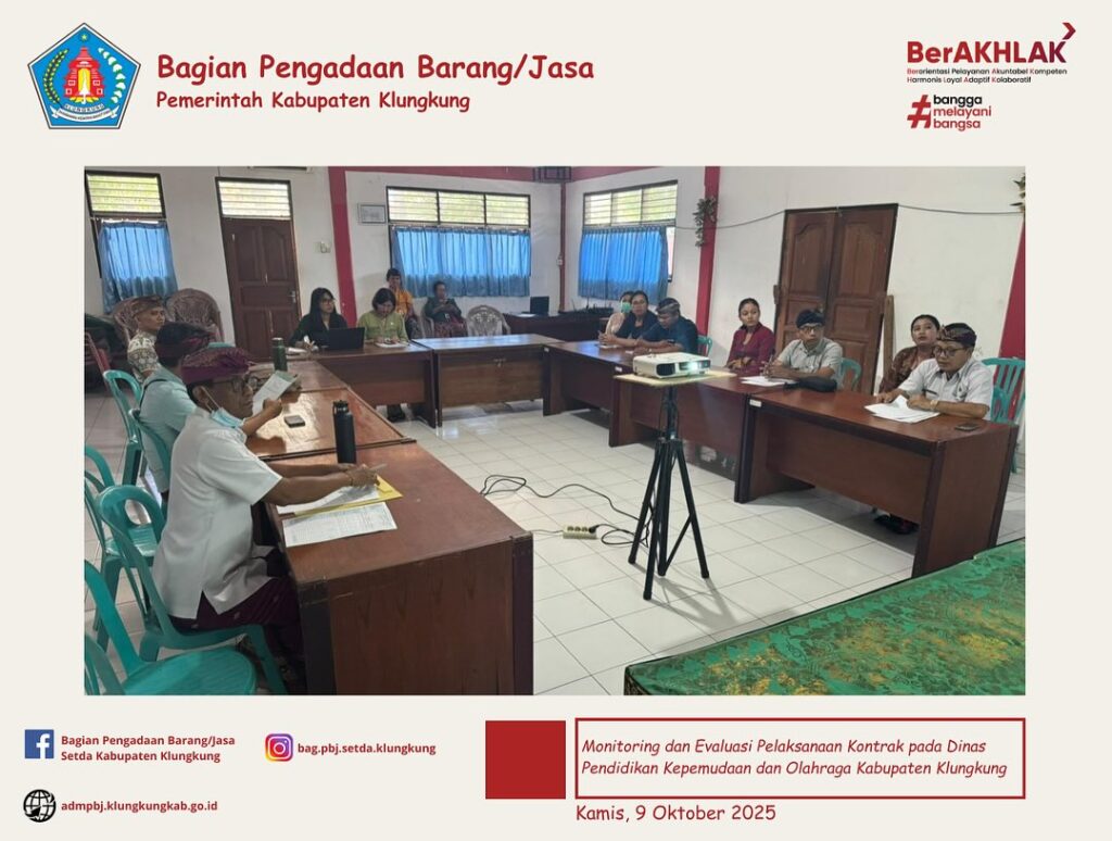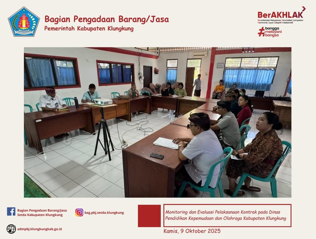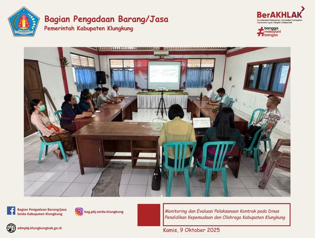 Monitoring dan Evaluasi Pelaksanaan Kontrak Tahun Anggaran 2025 pada hari ini dipimpin oleh Kepala Bagian Pengadaan Barang/Jasa, Bapak Ir. Anak Agung Gede Anom Duarasoma, ST dengan didampingi fungsional pengelola pengadaan barang/jasa yang diterima oleh Sekretaris Dinas Pendidikan Kepemudaan dan Olahraga, Bapak I Nyoman Sukadana,S.E.,M.M beserta jajaran.