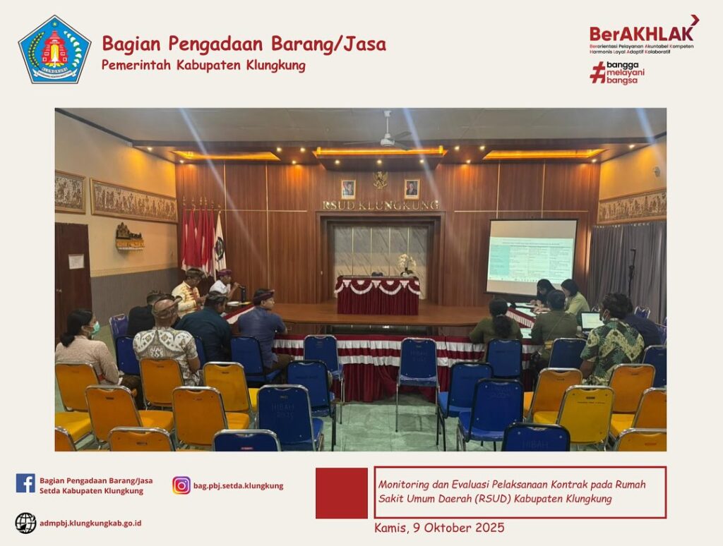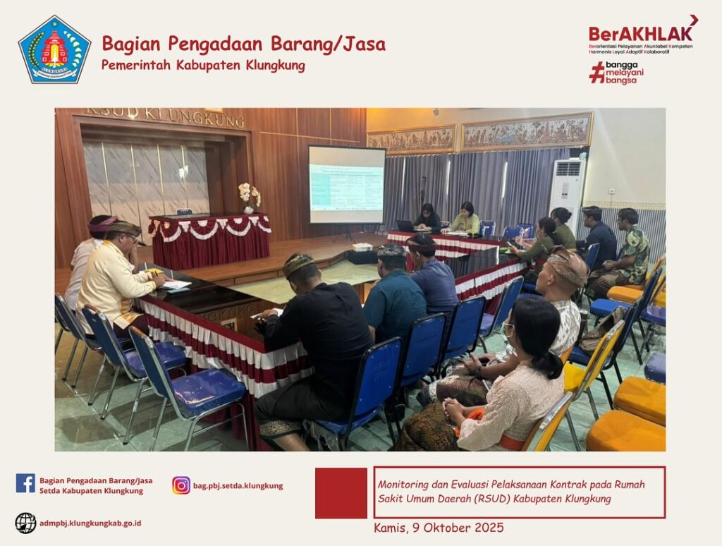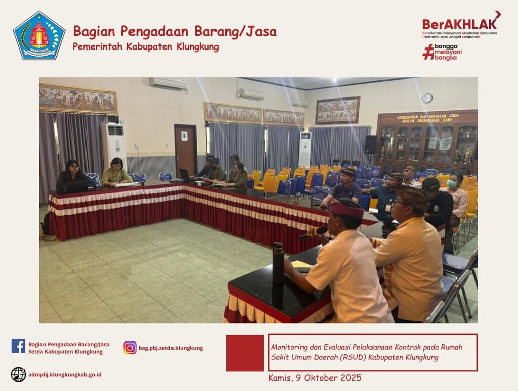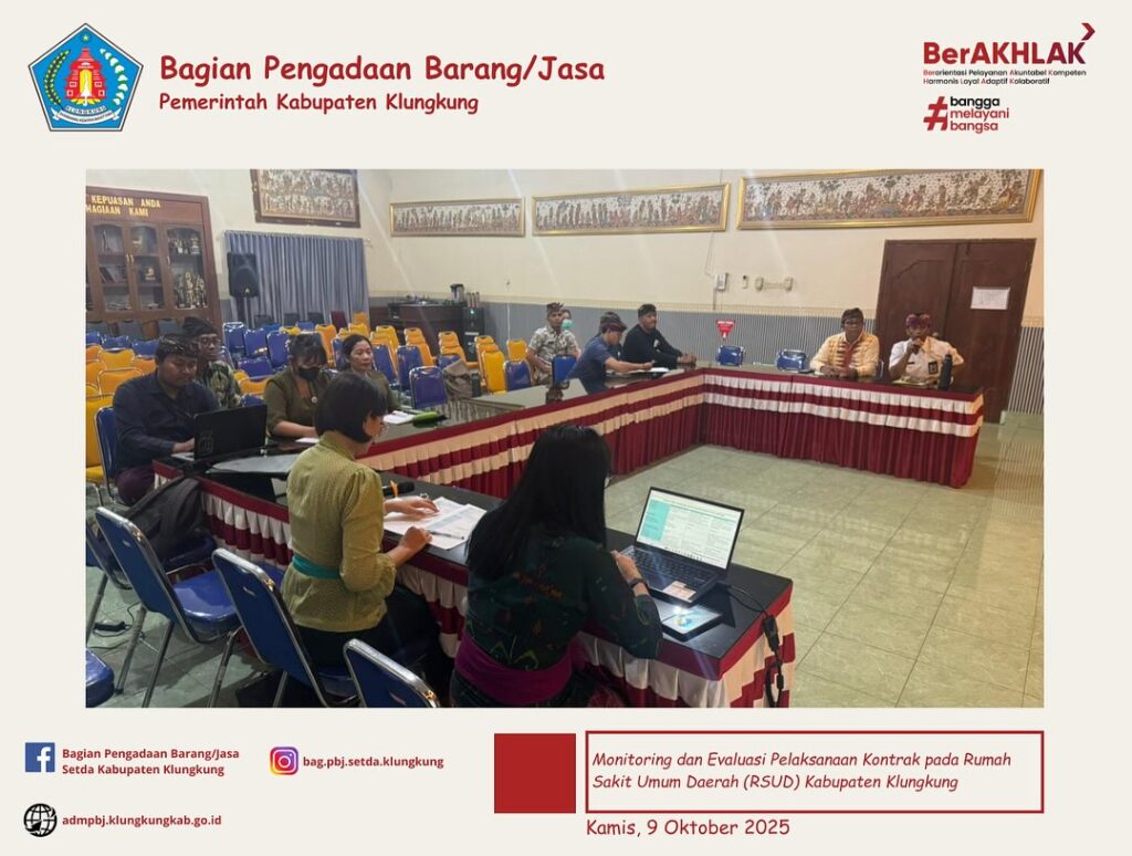 Monitoring dan Evaluasi Pelaksanaan Kontrak Tahun Anggaran 2025 pada hari ini dipimpin oleh Kepala Bagian Pengadaan Barang/Jasa, Bapak Ir. Anak Agung Gede Anom Duarasoma, ST dengan didampingi fungsional pengelola pengadaan barang/jasa yang diterima oleh Wakil Direktur RSUD, Bapak I Wayan Suwira, S.H.,M.M. beserta jajaran.