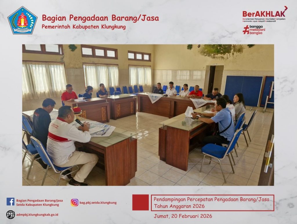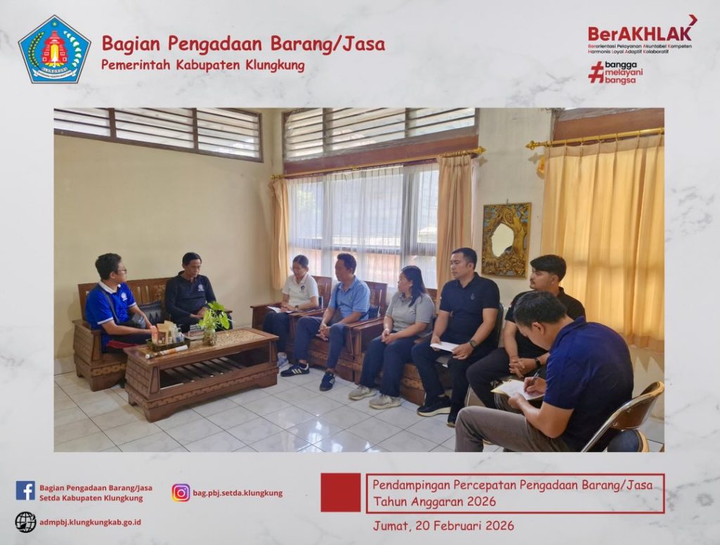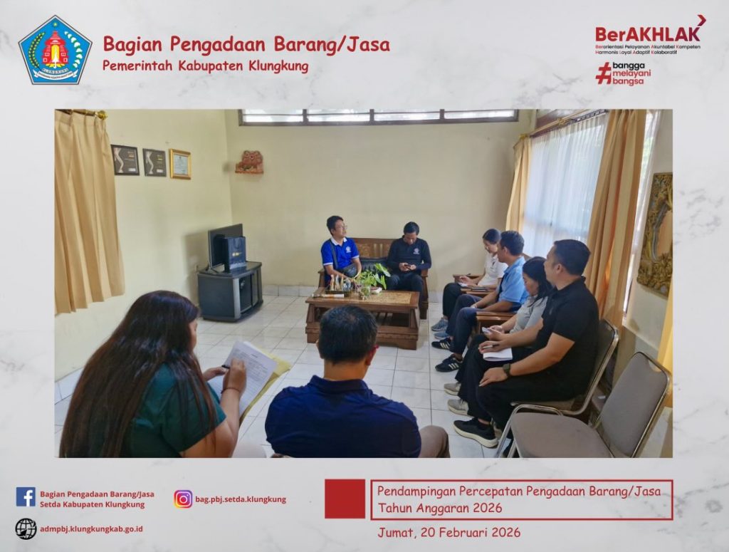 Dalam rangka Percepatan Pemenuhan Kebutuhan Barang/Jasa dan Pelaksanaan Pengadaan Barang/Jasa Pemerintah di lingkungan Pemerintah Daerah Kabupaten Klungkung Tahun Anggaran 2026, Bagian Pengadaan Barang/Jasa Setda Kabupaten Klungkung melaksanakan Pendampingan Percepatan Pengadaan Barang/Jasa Tahun Anggaran 2026 pada Dinas Perhubungan serta Dinas Koperasi, Usaha Kecil dan Menengah, Perindustrian dan Perdagangan.