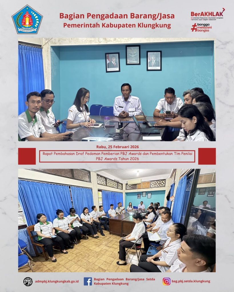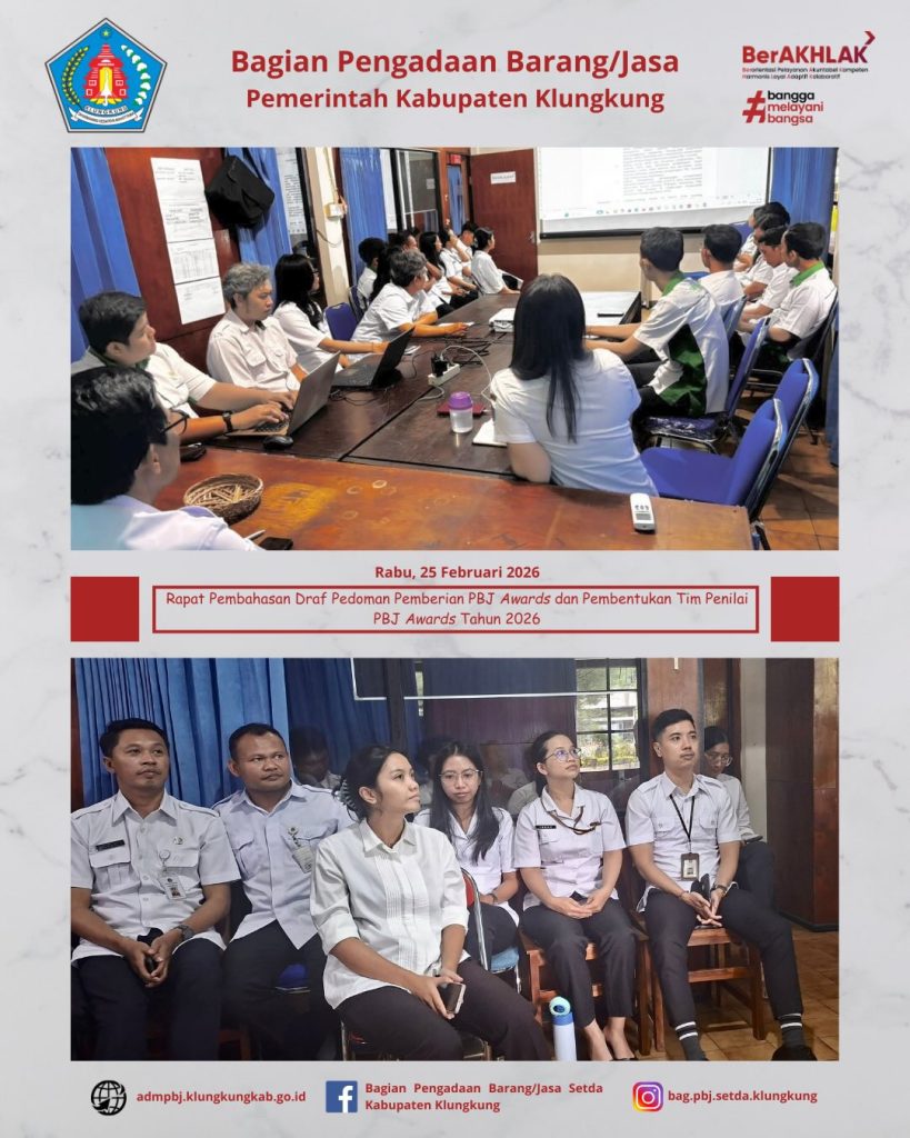 Dalam rangka mempersiapkan pelaksanaan PBJ Awards Tahun 2026, Bagian Pengadaan Barang/Jasa Setda Kabupaten Klungkung melaksanakan Rapat Pembahasan Draf Keputusan Bupati Klungkung tentang Pedoman Pemberian PBJ Awards dan Pembentukan Tim Penilai PBJ Awards bagi Instansi di Lingkungan Pemerintah Kabupaten Klungkung Tahun 2026 yang bertempat di Ruang Rapat Bagian Pengadaan Barang/Jasa Setda Kabupaten Klungkung.