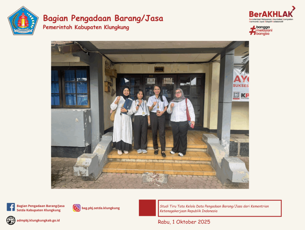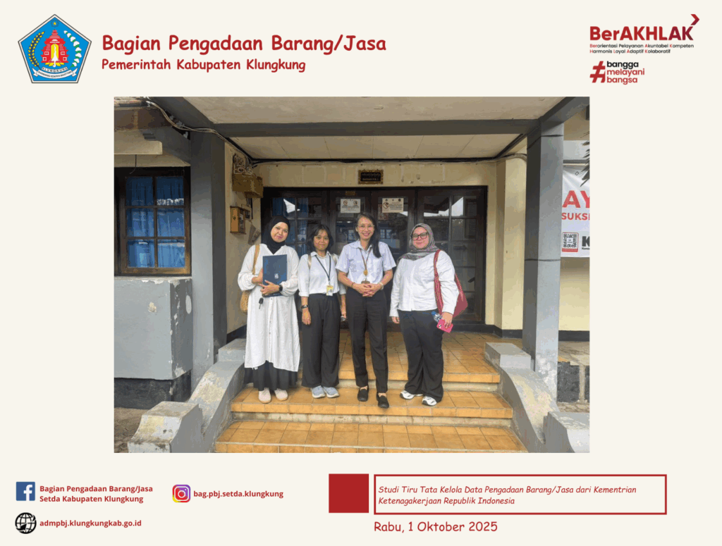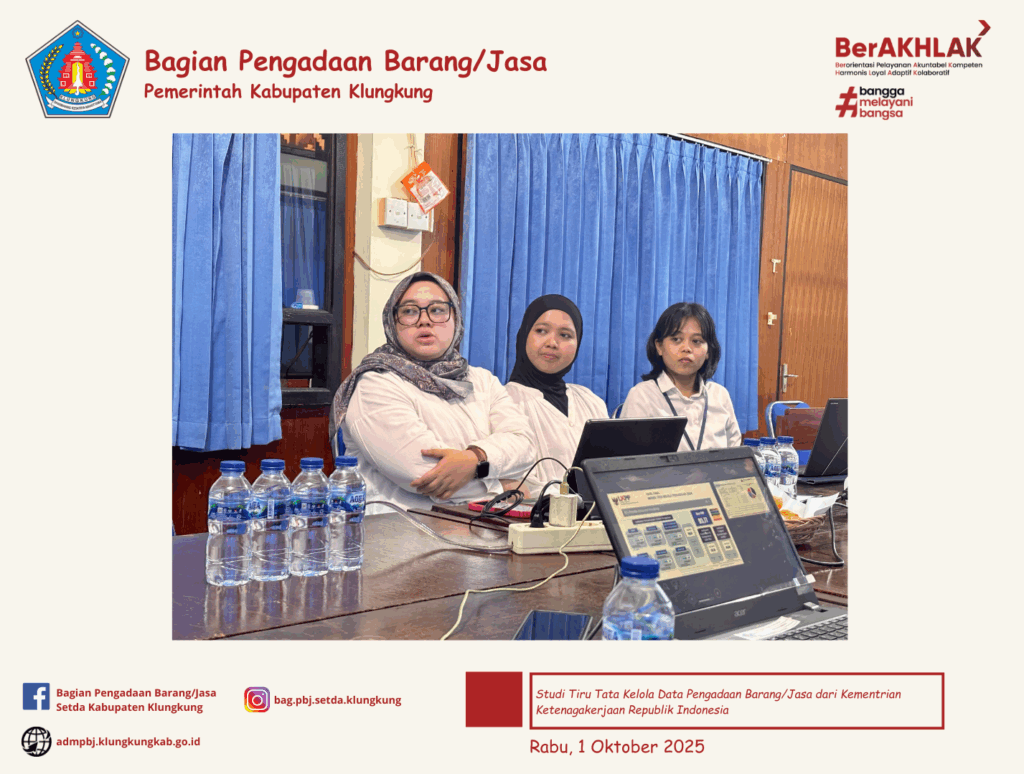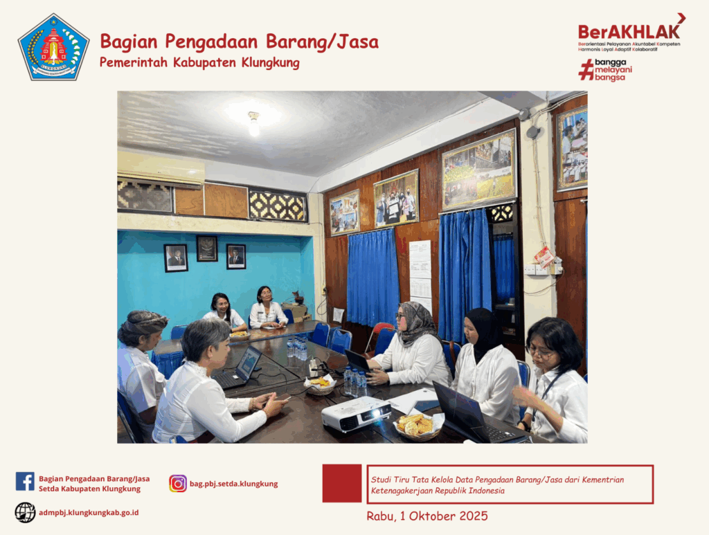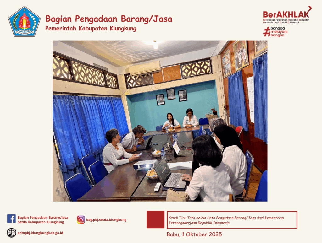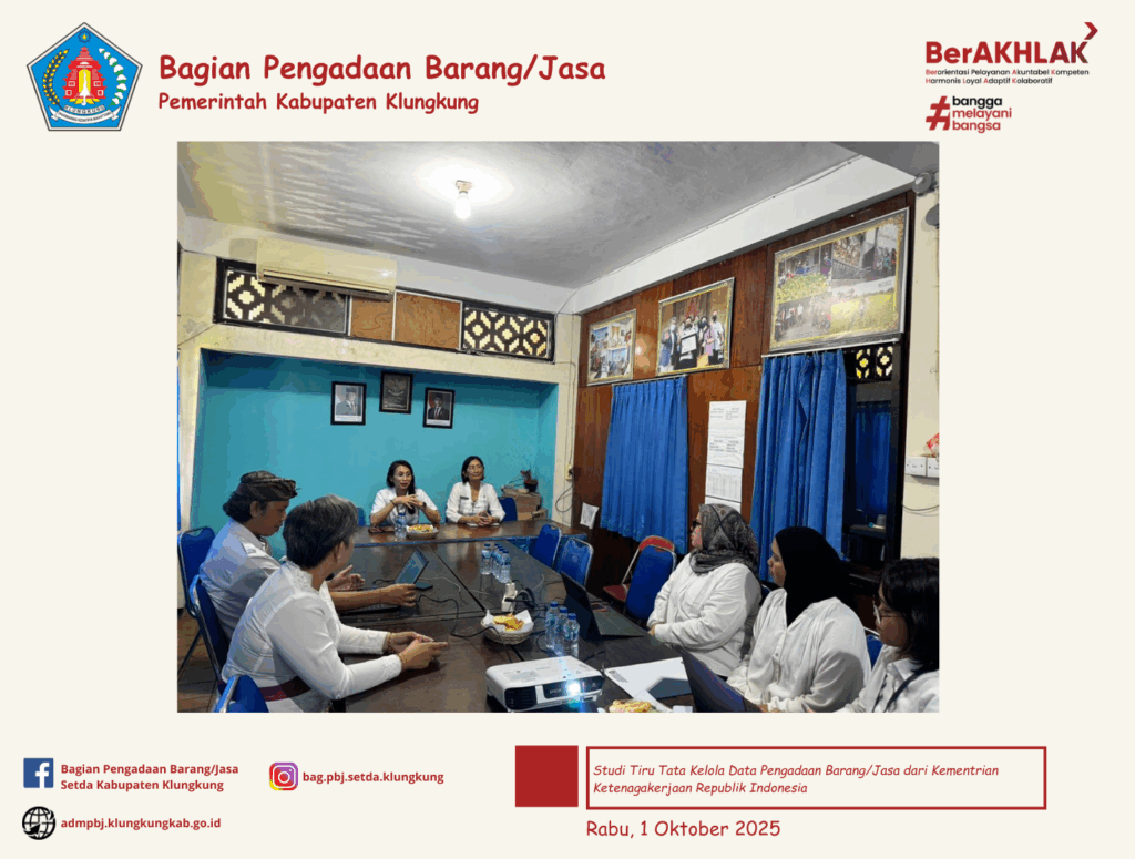 Kunjungan dari Unit Kerja Pengadaan Barang/Jasa Kementerian Ketenagakerjaan diikuti oleh Dina Arifiani selaku Jabatan Fungsional Pengeloa Pengadaan Barang/Jasa Ahli Pertama, Jeihan Hannissa selaku Penelaah Teknis Kebijakan dan Rati Kumala Dewi selaku Penata Layanan Operasional. Kunjungan diterima oleh Koordinator Bidang Pengelolaan Layanan Secara Elektronik, Ibu Ida Ayu Kurnia Dewi, S.Kom. dan Koordinator Bidang Pengelolaan Pengadaan Barang/Jasa, Ibu Putu Gd Sri Wismayani, S.T., M.Si., beserta staf dan JF Prakom Ahli Pertama di Bagian Pengadaan Barang/Jasa Setda Kabupaten Klungkung.