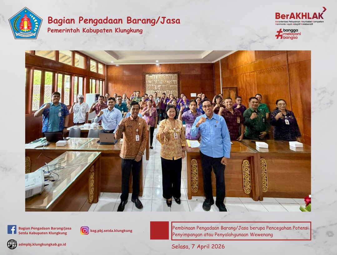 Semarapura, 7 April 2026 Dalam rangka meningkatkan efisiensi dan efektivitas pengadaan barang/jasa agar dapat dilakukan dengan cepat, tepat sasaran, efisien dalam penggunaan anggaran serta kegiatan pengadaan barang/jasa memiliki potensi implikasi permasalahan hukum maka Bagian Pengadaan Barang/Jasa Setda Kabupaten Klungkung melaksanakan Pembinaan Pengadaan Barang/Jasa berupa pencegahan potensi penyimpangan atau penyalahgunaan wewenang kepada pengelola Pengadaan Barang/Jasa di … Baca Selengkapnya