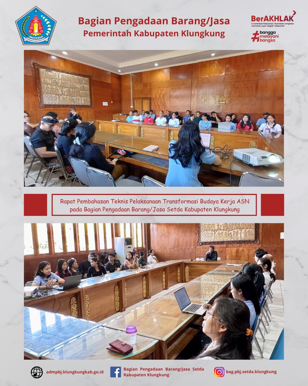 Semarapura, 10 April 2026 Dalam rangka menindaklanjuti Surat Edaran Bupati Klungkung Nomor B.100.3.4.2/0074.1/Org/IV/2026 tentang Transformasi Budaya Kerja Aparatur Sipil Negara di Lingkungan Pemerintah Kabupaten Klungkung, maka dilaksanakan rapat pembahasan Teknis Pelaksanaan Transformasi Budaya Kerja Aparatur Sipil Negara pada Bagian Pengadaan Barang/Jasa Setda Kabupaten Klungkung dengan mengacu pada Petunjuk Teknis Pelaksanaan Nomor B.061.2/0409.1/IV/BKPSDM/2026 yang bertempat di … Baca Selengkapnya